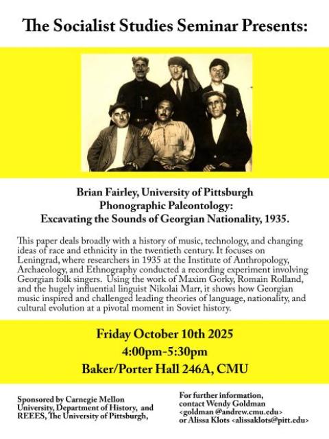 This paper deals broadly with a history of music, technology, and changing ideas of race and ethnicity in the twentieth century. It focuses on Leningrad, where researchers in 1935 at the Institute of Anthropology, Archaeology, and Ethnography conducted recording experiments involving Georgian folk singers. Using the work of Maxim Gorky, Romain Rolland, and the hugely inflectional linguist Nikolai Marr, it shows how Georgian music inspired and challenged leading theories of language, nationality, and cultural evolution at a pivotal moment in Soviet history. Part of the Socialist Studies Seminar series.