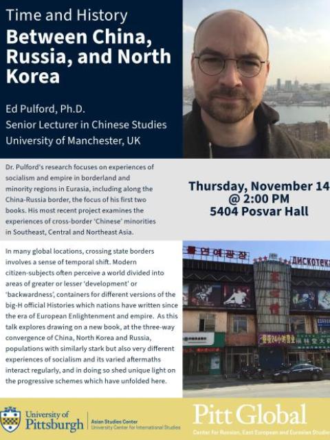 Dr. Pulford's research focuses on experiences of socialism and empire in borderland and minority regions in Eurasia, including along the China-Russia border, the focus of his first two books. His most recent project examines the experiences of cross-border ‘Chinese’ minorities in Southeast, Central and Northeast Asia. In many global locations, crossing state borders involves a sense of temporal shift. Modern citizen-subjects often perceive a world divided into areas of greater or lesser ‘development’ or ‘backwardness’, containers for different versions of the big-H official Histories which nations have written since the era of European Enlightenment and empire. As this talk explores drawing on a new book, at the three-way convergence of China, North Korea and Russia, populations with similarly stark but also very different experiences of socialism and its varied aftermaths interact regularly, and in doing so shed unique light on the progressive schemes which have unfolded here.