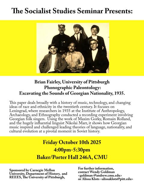 This paper deals broadly with a history of music, technology, and changing ideas of race and ethnicity in the twentieth century. It focuses on Leningrad, where researchers in 1935 at the Institute of Anthropology, Archaeology, and Ethnography conducted recording experiments involving Georgian folk singers. Using the work of Maxim Gorky, Romain Rolland, and the hugely inflectional linguist Nikolai Marr, it shows how Georgian music inspired and challenged leading theories of language, nationality, and cultural evolution at a pivotal moment in Soviet history. Part of the Socialist Studies Seminar series.