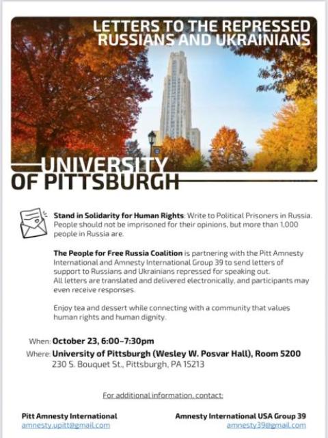 The People for Free Russia Coalition is partnering with the Pitt Amnesty International and Amnesty International Group 39 to send letters of support to Russians and Ukrainians repressed for speaking out. All letters are translated and delivered electronically, and participants may even receive responses.